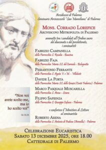 Sabato 13 dicembre alle ore 18.00 nella Chiesa Cattedrale la Celebrazione Eucaristica presieduta dall’Arcivescovo di Palermo Mons. Corrado Lorefice che ammetterà tra i candidati all’Ordine sacro del Diaconato e del Presbiterato sei alunni del Seminario Arcivescovile “San Mamiliano”.