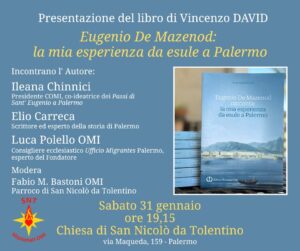 “Eugenio De Mazenod: la mia esperienza da esule a Palermo” è il libro di Vincenzo David (Editrice Missionari Omi) che sarà presentato sabato 31 gennaio 2026 alle ore 19.15 presso la Chiesa di San Nicolò da Tolentino (via Maqueda 159, Palermo).