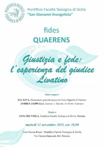 “Giustizia e fede: l’esperienza del giudice Livatino” è il tema dell’incontro in programma martedì 11 novembre alle ore 18 presso la Facoltà Teologica di Sicilia “San Giovanni Evangelista”. Interverranno Lia Sava, Procuratore Generale presso la Corte d’Appello di Palermo e Andrea Zappulla, Giurista e Docente di Diritto Canonico. Modera i lavori Anna Pia Viola, Docente della Facoltà Teologica di Sicilia.