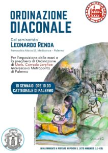 Sabato 10 gennaio 2026 alle ore 10.00 nella Chiesa Cattedrale di Palermo l’alunno del Seminario Arcivescovile Leonardo Renda, della Parrocchia Maria SS. Mediatrice in Palermo, per l’imposizione delle mani e la preghiera di Ordinazione dell’Arcivescovo Mons. Corrado Lorefice sarà ordinato Diacono della Chiesa di Palermo.