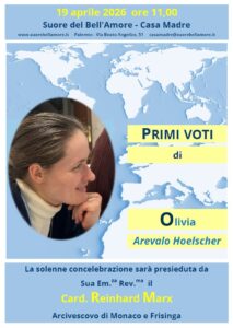 Domenica 16 aprile 2026, nella Casa Madre di via Beato Angelico 51 a Palermo alle ore 11.00, saranno celebrati i primi voti di Olivia Arevalo Hoelscher, novizia delle Suore del Bell’Amore. La solenne concelebrazione sarà presieduta dal Cardinale Reinhard Marx, Arcivescovo di Monaco e Frisinga.