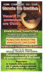 Organizzata da USMI, CISM, OVID e CIIS, la Giornata Pro Orantibus dell’Arcidiocesi di Palermo sarà vissuta presso il Monastero dell’Immacolata Concezione delle Suore Benedettine di via Marchese di Villabianca 99 a Palermo.